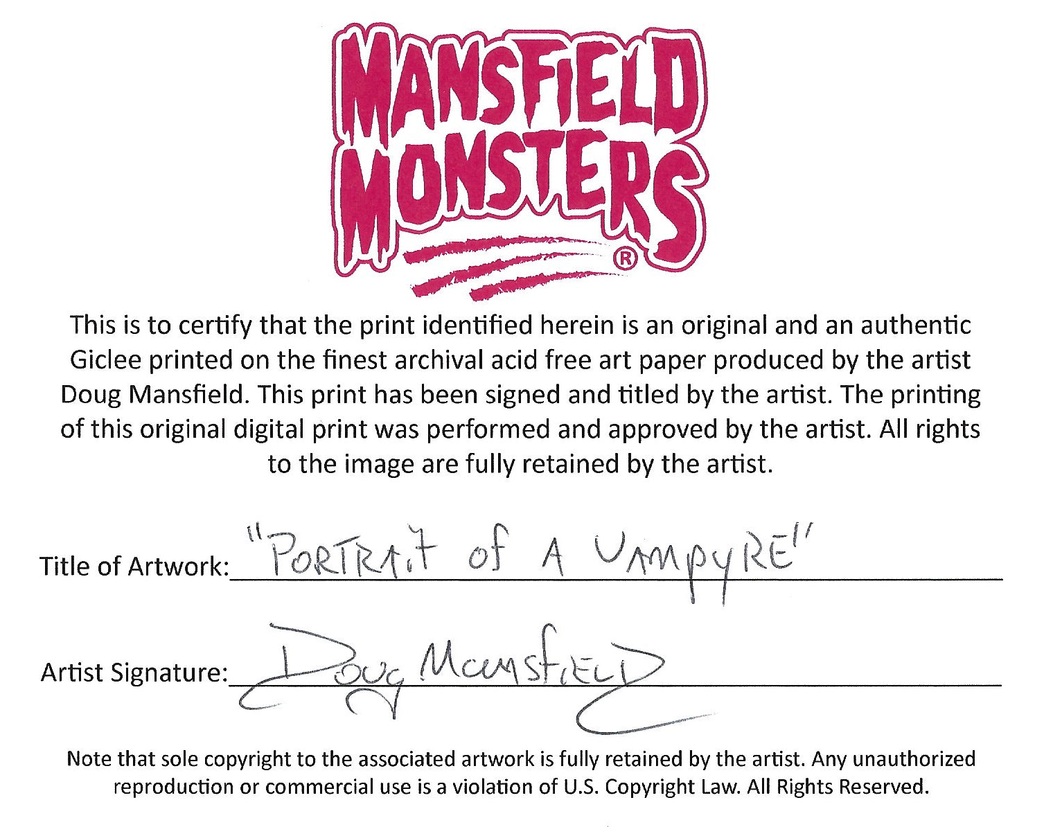 - Title hand written and signed by Doug Mansfield on back of print